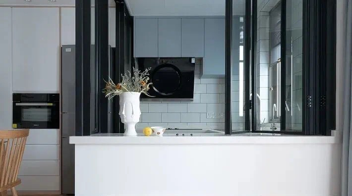 這是最靈活也是最常見的中西分廚的形式,適用于大多數的家庭。 可以因地制宜地將西廚房設置在客廳、餐廳甚至是吧臺,只要是其他有空余位置的就可以。