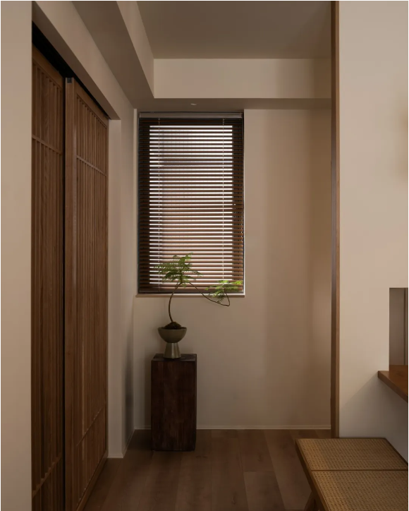 玄關左側以植物端景為列,右側上下定制透氣性更強的懸浮吊柜,用以日常鞋履的儲放。