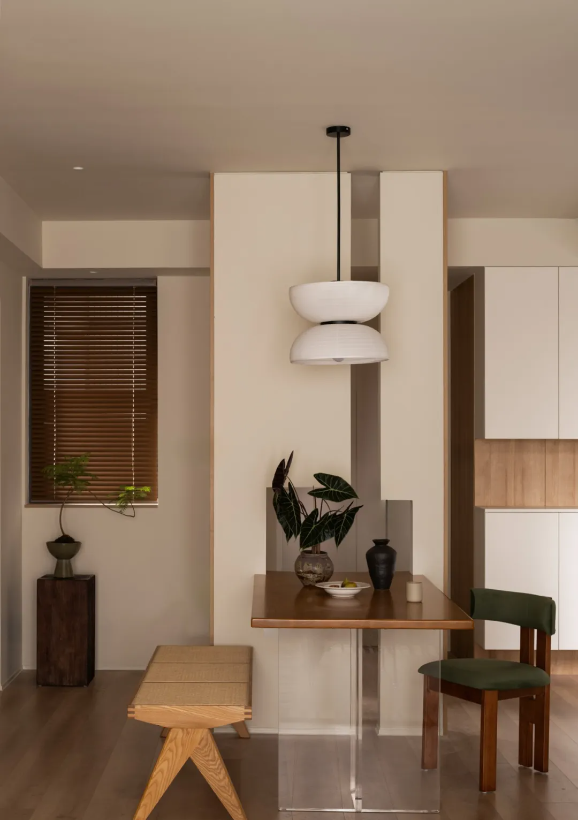 入戶以回歸自然為主旨,將傳統的可觀游園林設計手法帶入,餐桌的正中位置為點,新建墻體,將玄關獨立。