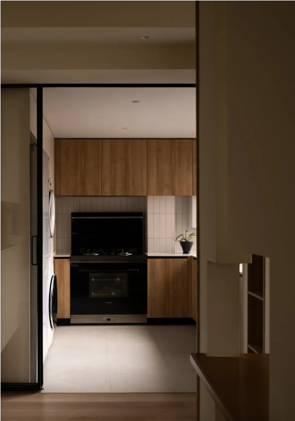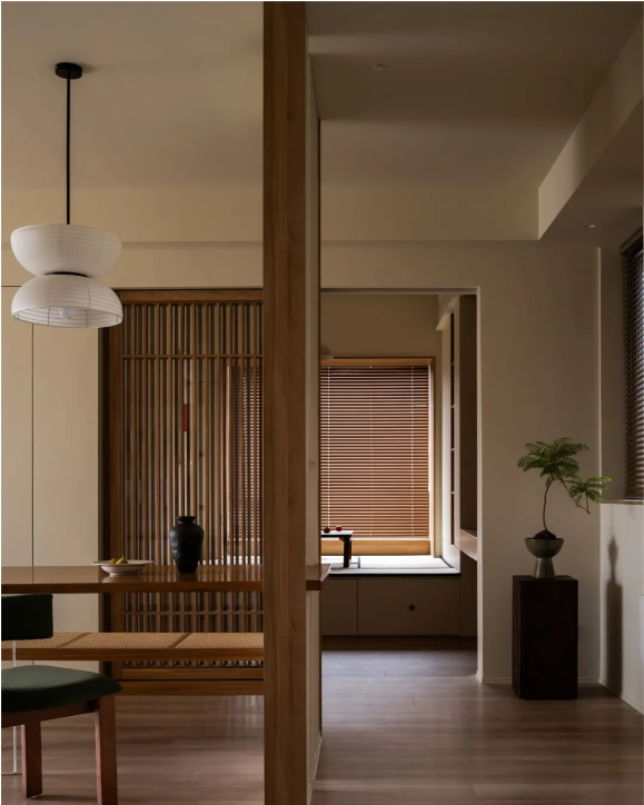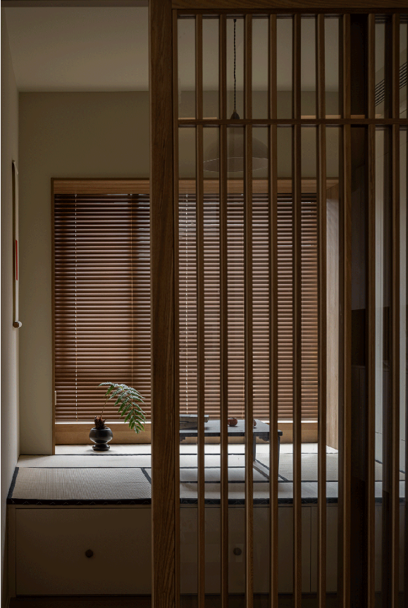 木柵推拉門可開可合,內外功能隨之互聯,開闊透亮之余,最大化放大空間視覺。