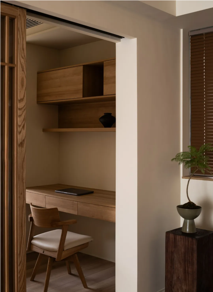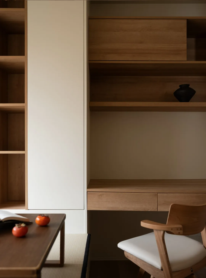 一間臥室,改變動線后,設計為集辦公、儲物、閱讀、茶室、臨時客房一體的多功能空間。
