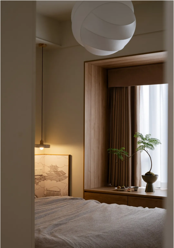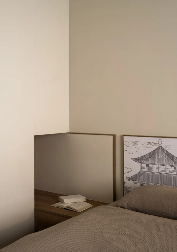 臥室延續外部素雅色調,局部融入飽含東方美學意境的墻頭插畫,給予足夠優雅、舒適的睡眠氛圍。