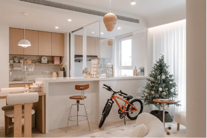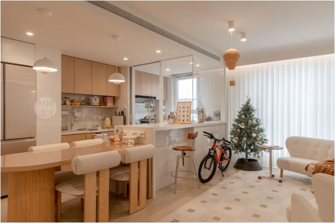 客餐廚三區無縫銜接,開放式布局讓空間感倍增,小戶型也能享受大宅的開闊視野。溫暖的奶油色調搭配柔和燈光,營造出溫馨舒適的居家氛圍。