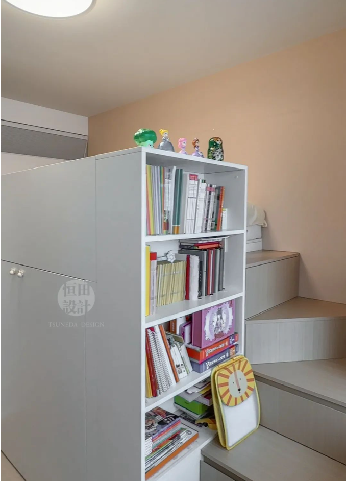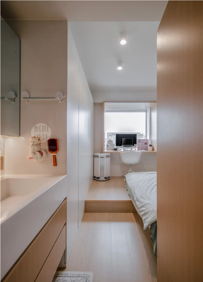 在這2.3m3的立面空間里,收納超乎想象。上方床、下方衣帽間、轉角處儲物抽屜,再加開放格書柜。「麻雀雖小,可五臟俱全」,落為現實。
