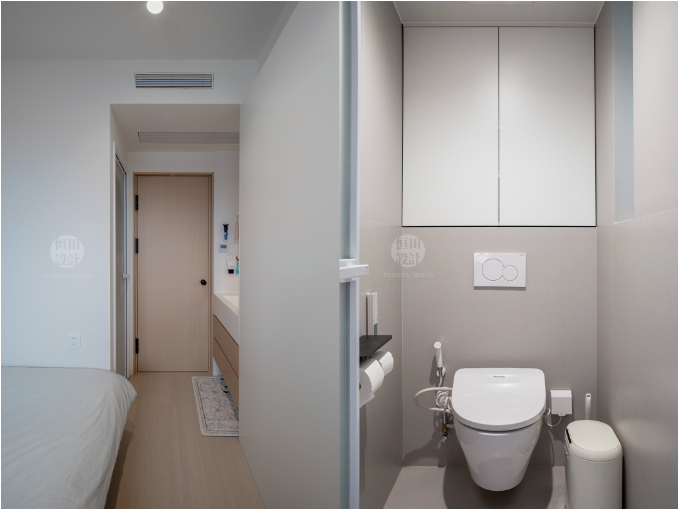 小主臥也能有獨立衛生間。洗漱區外置,滿足日常洗漱。恭桶區內采用油砂玻璃,盡可能借助自然采光。馬桶后留15cm薄柜,放些日用品最合適不過了。