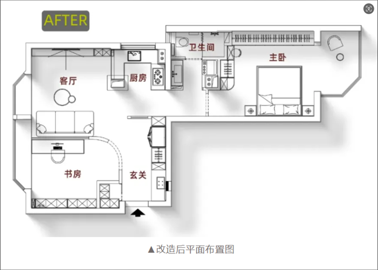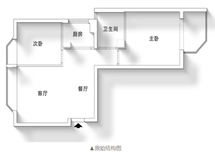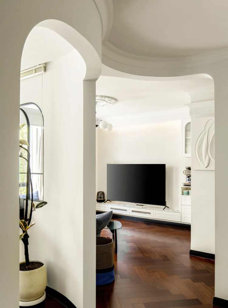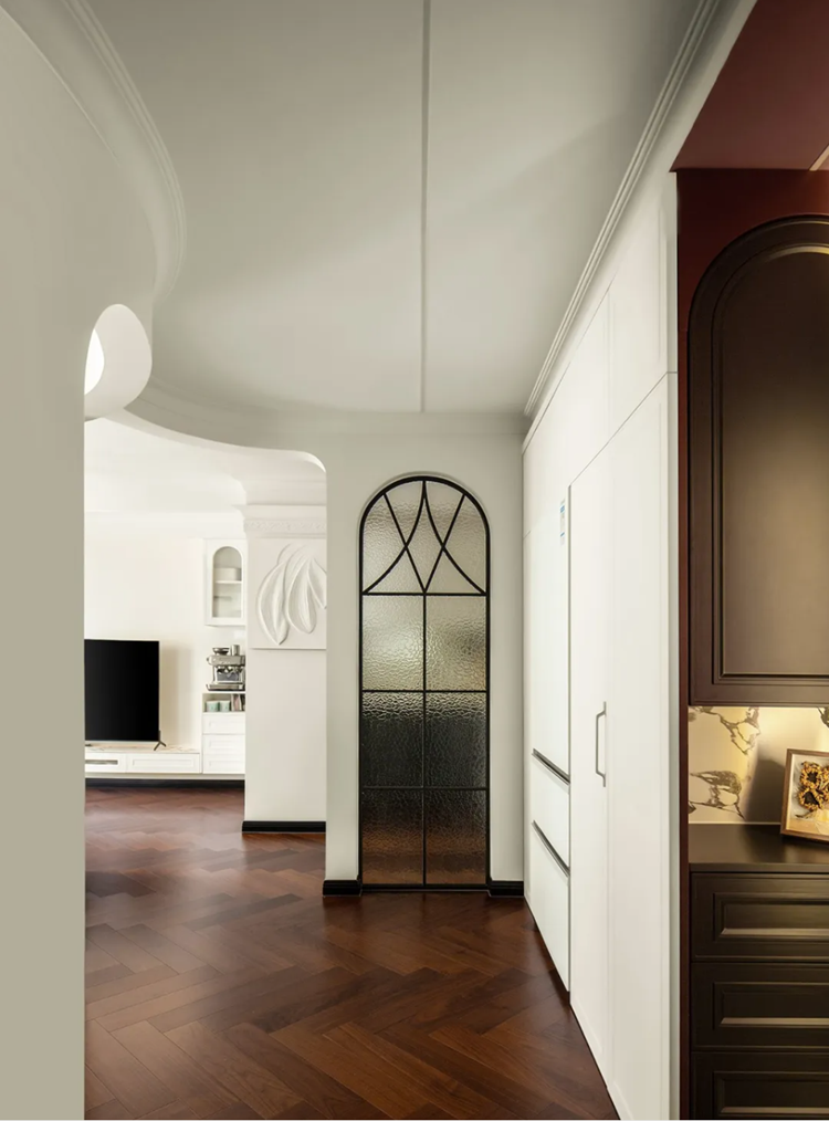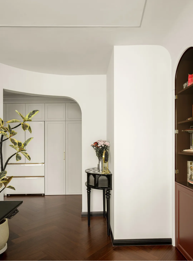 原始入戶的大開間在重新規(guī)劃后形成了一條新的弧形動(dòng)線。