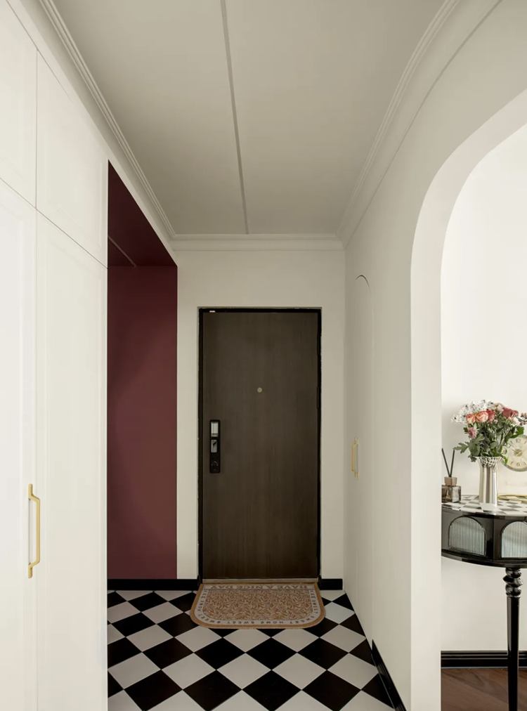 客廳與次臥對(duì)調(diào)后,形成獨(dú)立的玄關(guān)區(qū)域。左側(cè)則是暗藏的MINI玄關(guān)庫,充分滿足了入戶空間收納的需求。黑白方磚將玄關(guān)與室內(nèi)區(qū)分開來,方便日常清潔。