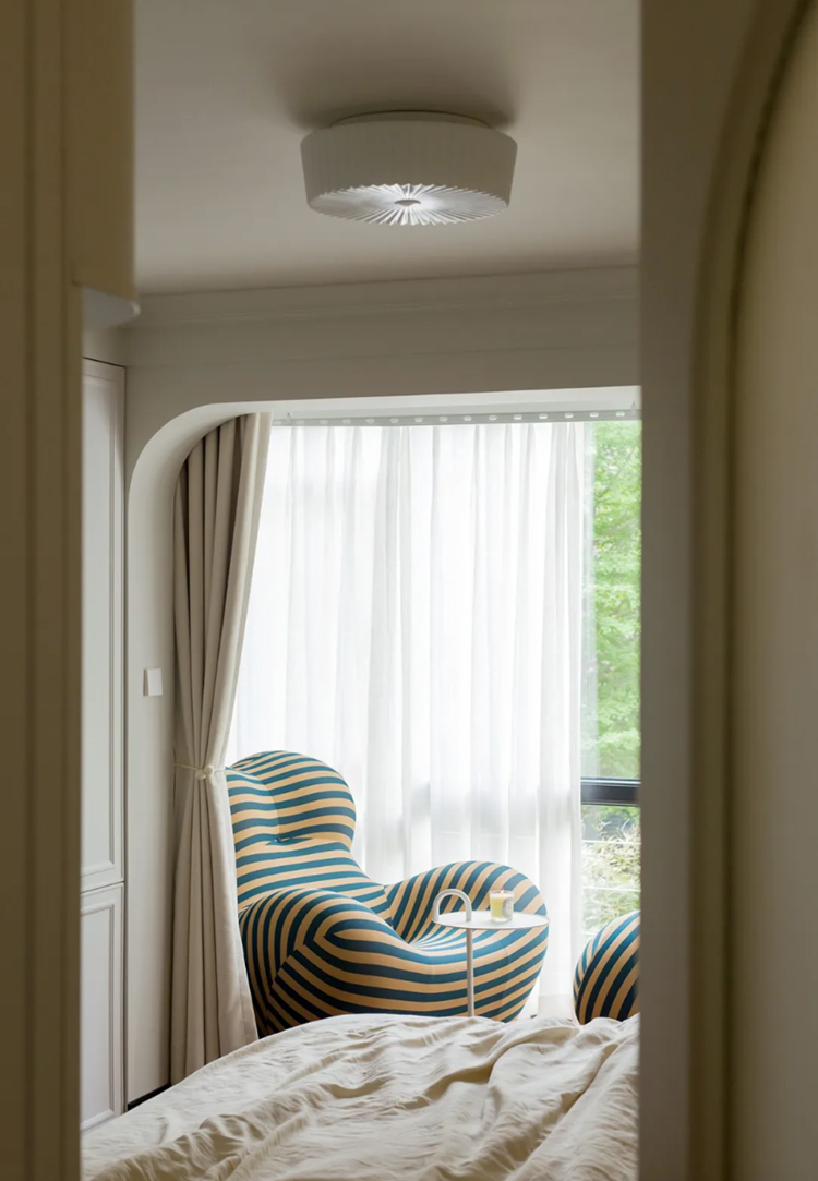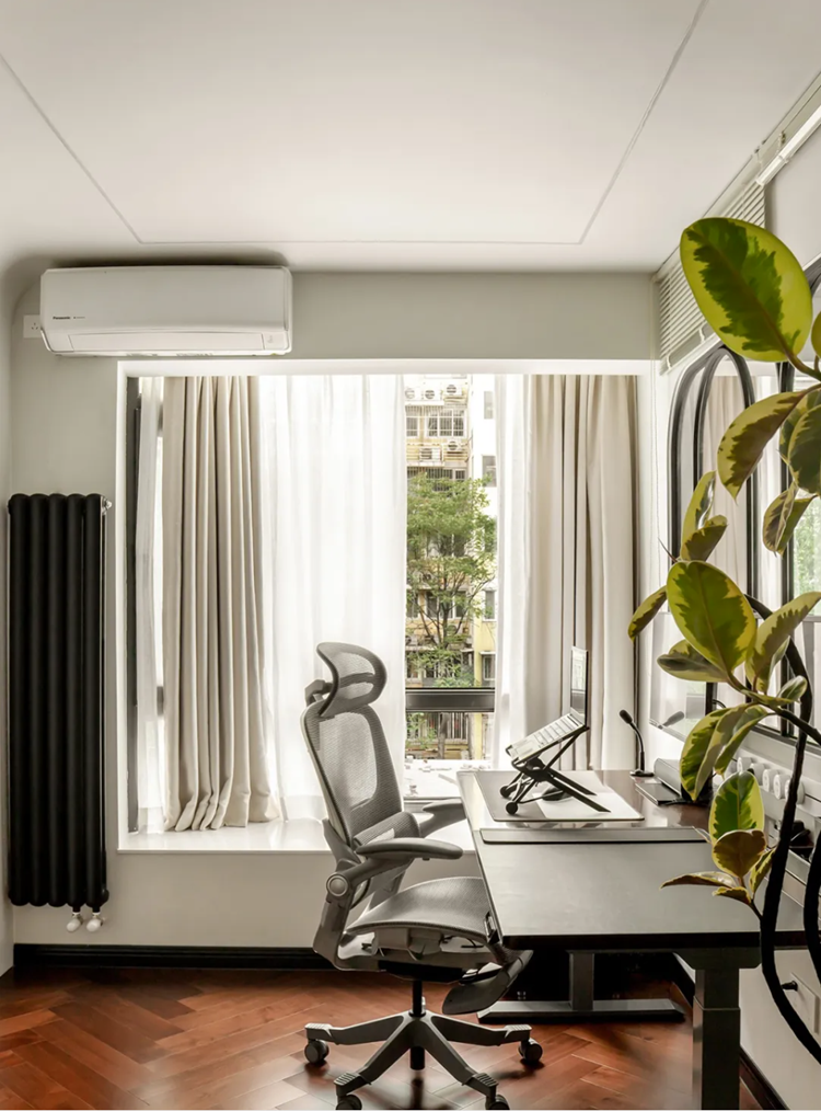 原次臥目前做書房使用,做成了半開放式空間,曲面造型讓空間的過渡更加自然流暢。