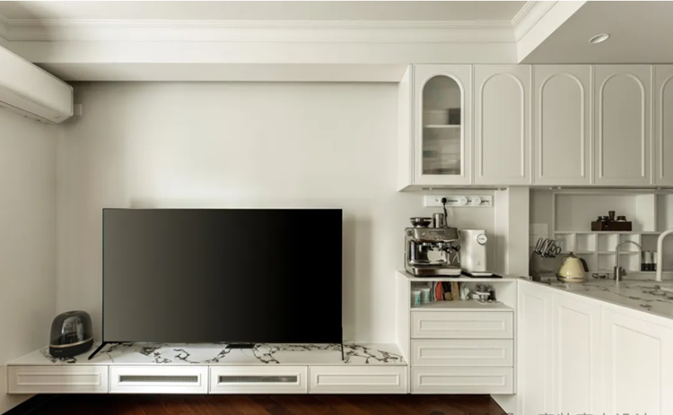 定制柜一直延續(xù)到客廳,空間利用得非常充分。白色柜門加入簡(jiǎn)潔的線條,更加美觀有層次感。