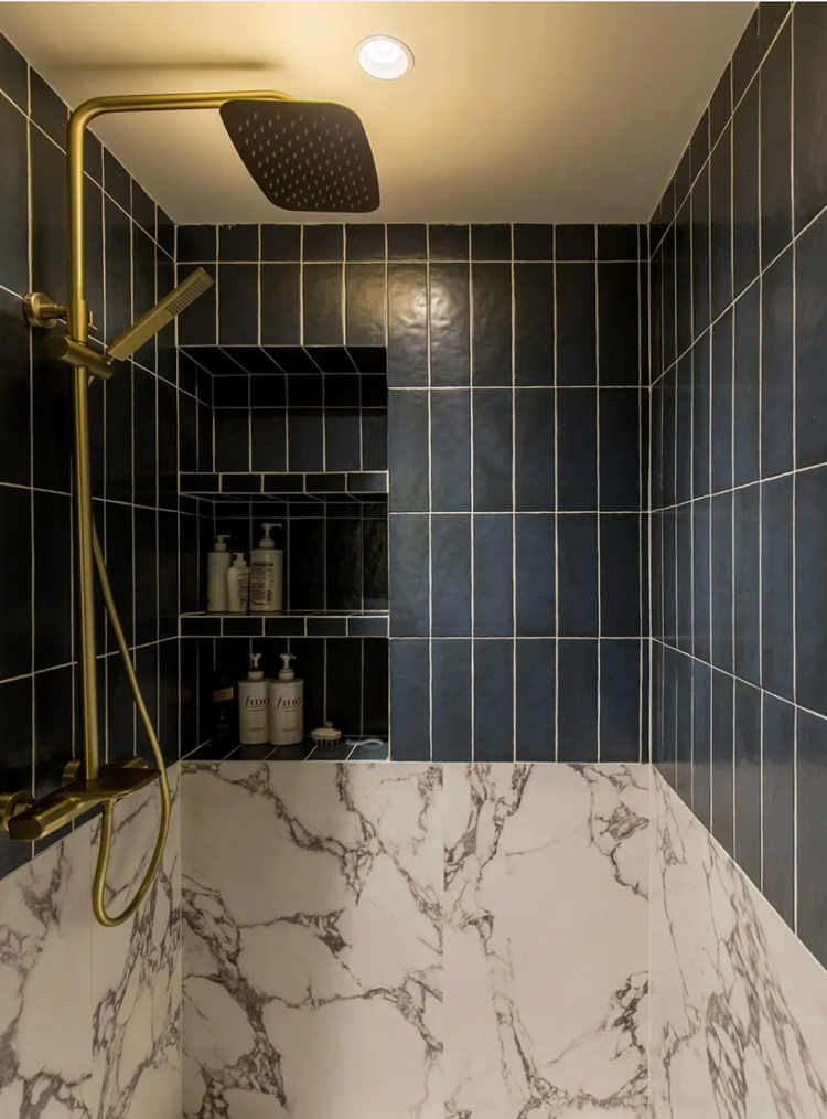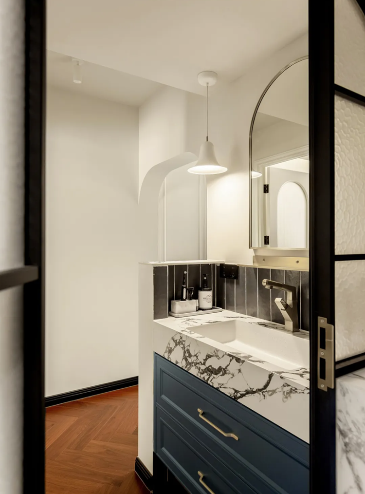 淋浴區(qū)做了下沉下理,能很好的避免洗澡水流出。藍(lán)色與大理石紋的搭配延續(xù)了整體的格調(diào)。